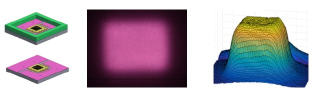 Figure 2. One-Watt module design with optical diffuser for time-of-flight (TOF) application (left), projection on object (middle), and 3D far field profile (right).