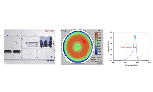 Figure 1. Vertilite MOCVD Technology (left), reflectance mapping of one 850 VCSEL wafer (middle), and quantum well photoluminescence spectra of typical 808nm VCSEL wafers (right).